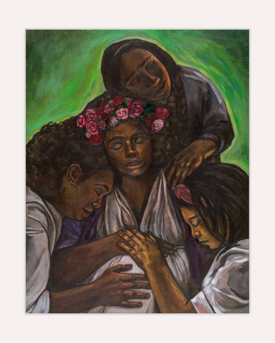 Black Mother Being Embraced by Community is a stunning and meaningful art print that highlights the beauty of collective care, sisterhood, and the transformative journey of motherhood. This artwork portrays a serene Black mother surrounded by a loving community of women, embodying the power of support and connection. The mother’s crown of roses symbolizes her resilience, strength, and the sacredness of her pregnancy journey.