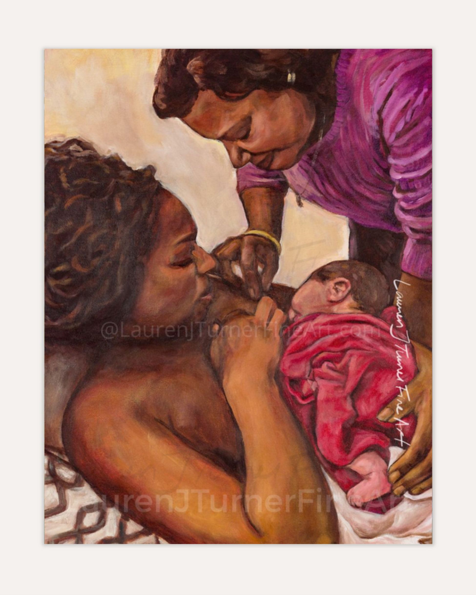 This artwork portrays the tender scene of a mother breastfeeding her baby for the first time, under the gentle guidance of her mother, symbolizing the wisdom and support passed down through generations. The warm, earthy tones and the soft, loving expressions create a sense of serenity and closeness, celebrating the beauty of motherhood and the nurturing bond that begins from the very first embrace.