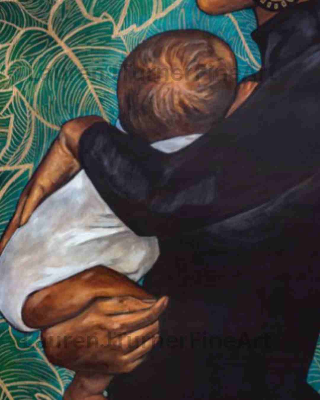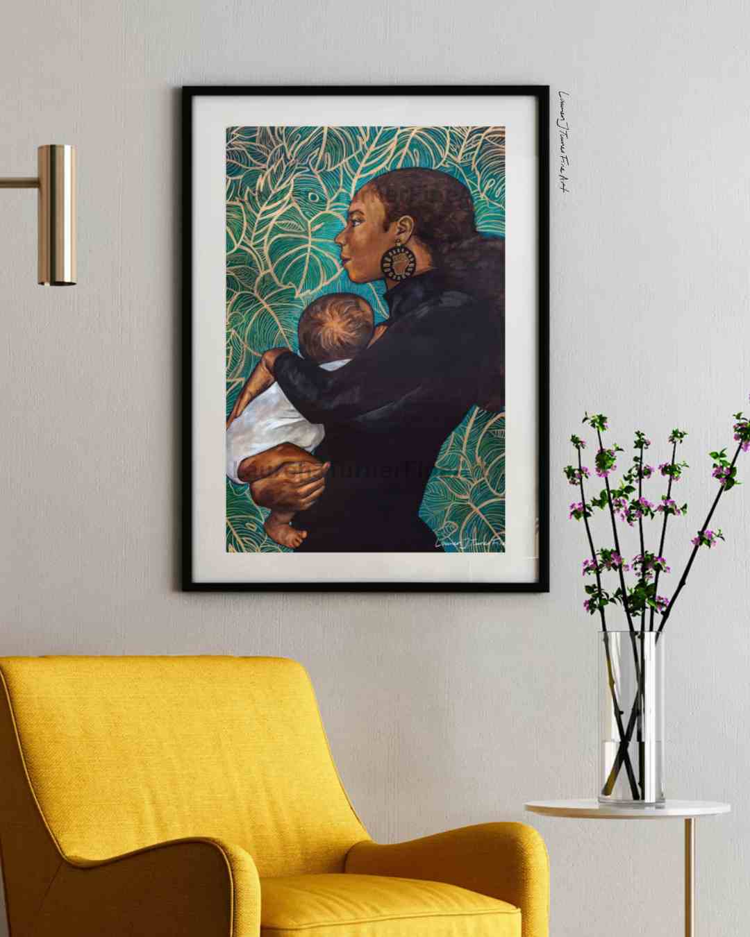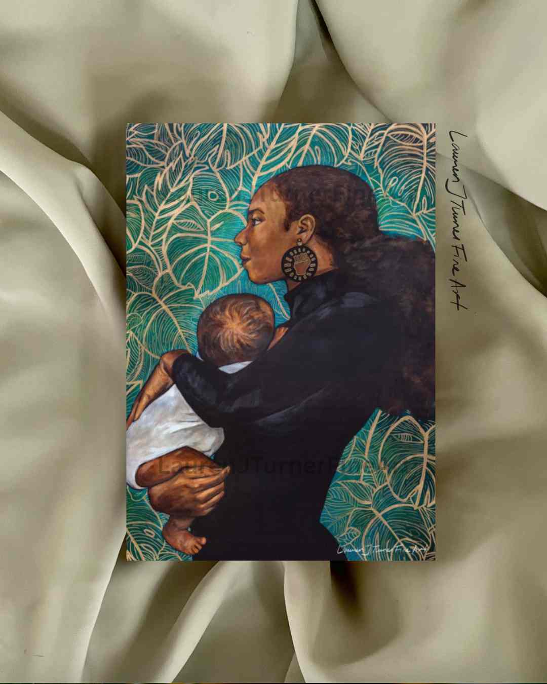 This stunning piece captures the essence of maternal strength, love, and advocacy. A Black mother cradles her child with a gaze of quiet determination, symbolizing the unwavering connection between parent and baby. The bold, textured background of gold and teal leaves evokes growth, resilience, and renewal, while her Afrocentric earrings proudly display empowerment and cultural pride.
