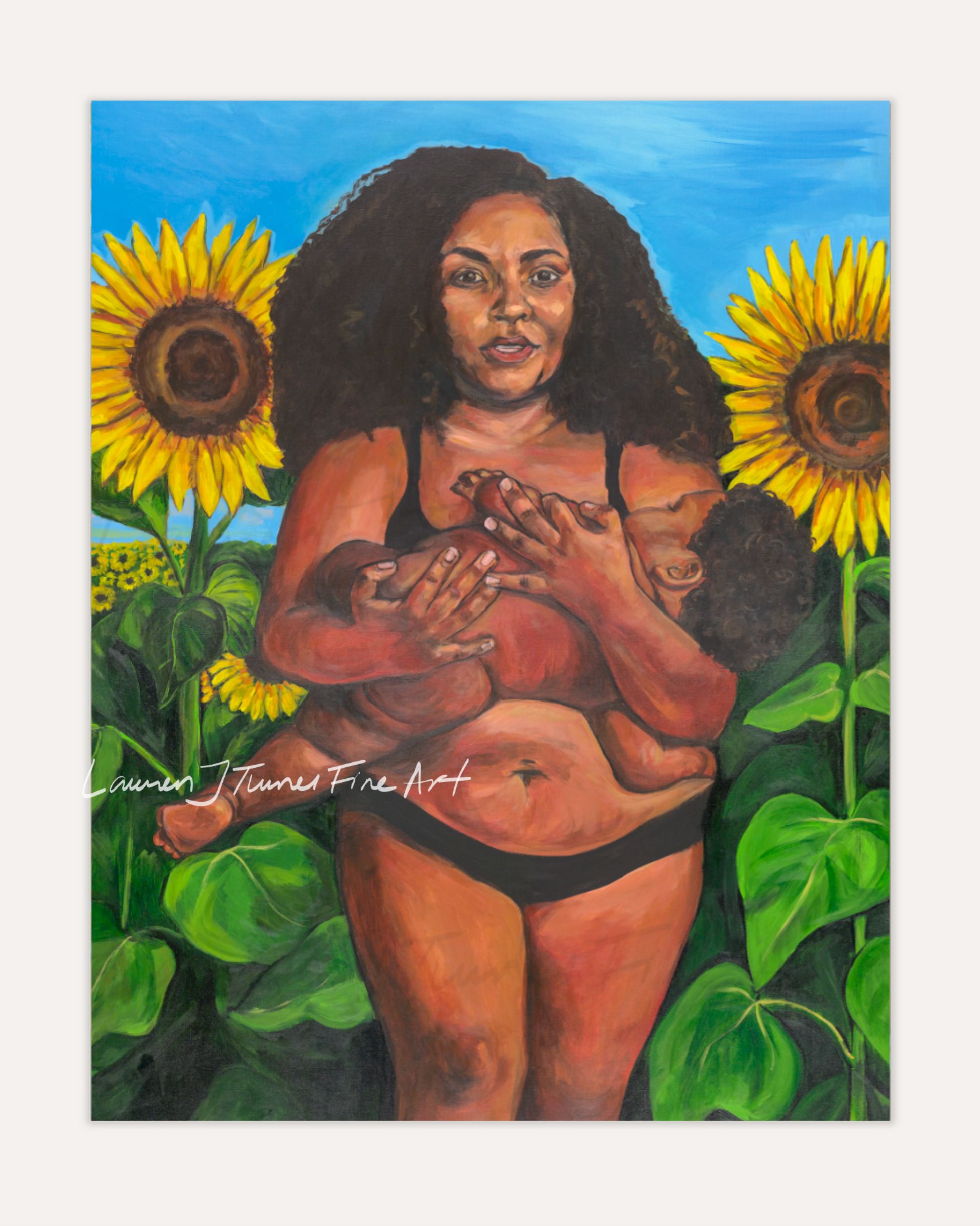 The powerful image celebrates the natural beauty and strength of motherhood, capturing an intimate moment of nourishment and connection. The mother’s serene expression and confident posture highlight the profound bond she shares with her child. Surrounded by the tall, radiant sunflowers against a clear blue sky, the scene symbolizes growth, positivity, and the nurturing environment mothers provide. The lush greenery and bold colors further emphasize the theme of renewal and life. This piece is a tribute to the resilience and beauty of Black motherhood, showcasing the grace and power inherent in the act of breastfeeding.