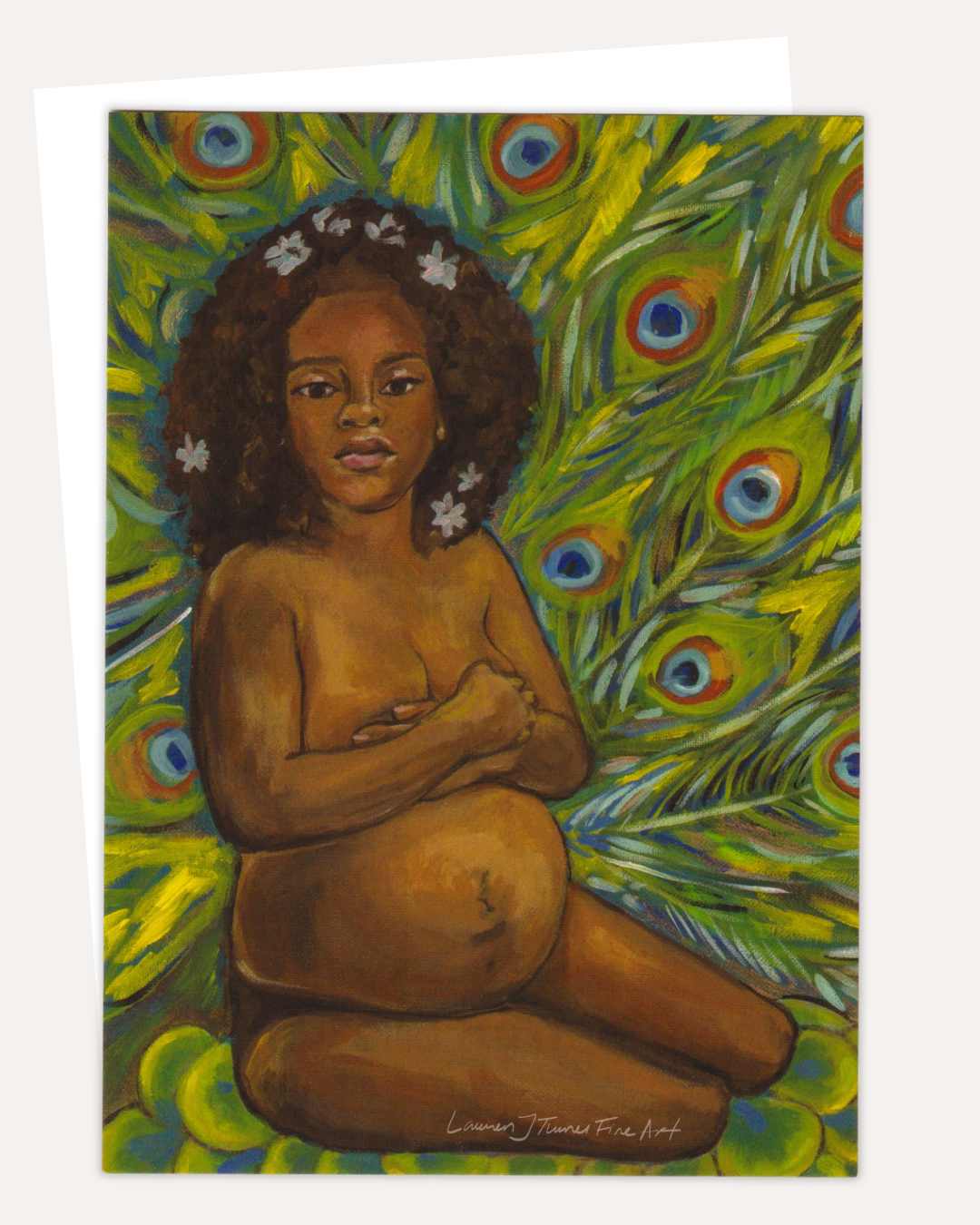 Pregnancy Peacock captures the tender and intimate moment of a black pregnant new mother cradling her chest with a profound sense of love and protection. The expectant mother is depicted with an expression of serene contentment as she holds herself. Surrounded by the iridescent beauty of peacock feathers. With every brushstroke, “Pregnancy Peacock” celebrates the strength, beauty, and inherent grace of motherhood.