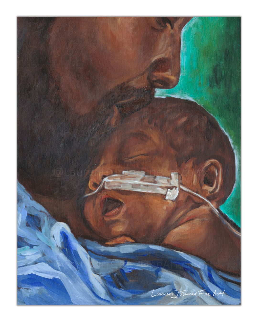 This piece is a tender portrayal of love and resilience. In this deeply intimate piece, I captured the powerful bond between a parent and their fragile newborn, who rests peacefully, supported and cradled with care. The soft, warm tones convey a sense of security and closeness, while the baby’s breathing tube is a subtle reminder of the strength required in challenging moments. This painting celebrates the beauty of connection even in vulnerable times.