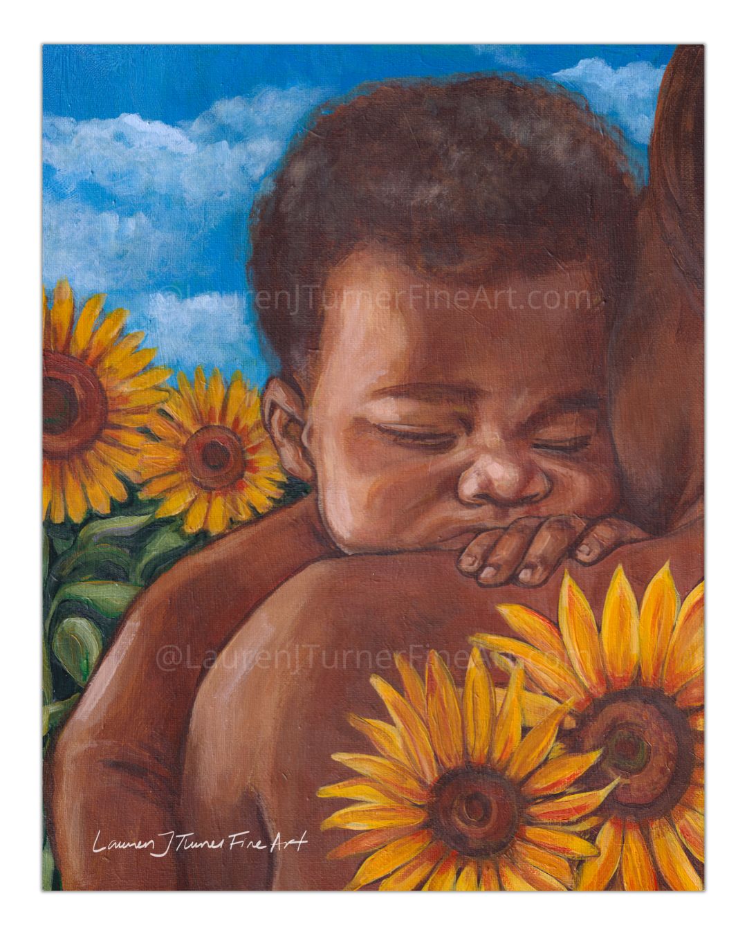 Bring the serenity of unconditional love into your space with Sleep Baby Near Sunflowers. This captivating art piece celebrates the beauty of parenthood and the gentle strength of human connection. This artwork features a peaceful baby resting against their caregiver’s shoulder, surrounded by vibrant sunflowers under a bright blue sky. Every detail radiates warmth, joy, and a sense of security. The perfect reminder of the deep bond between parent and child.