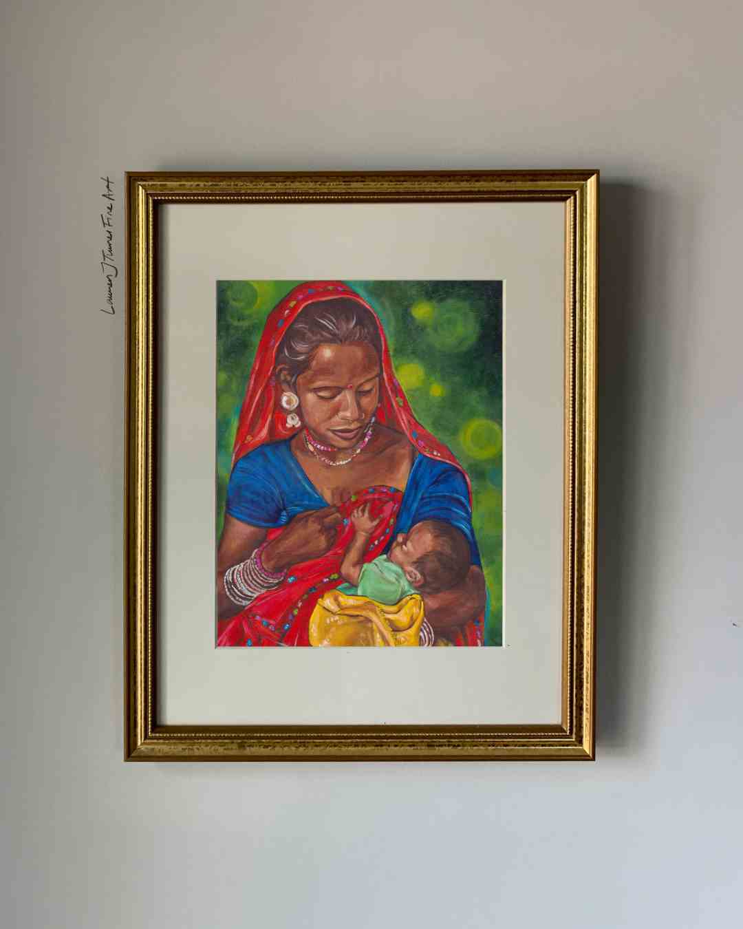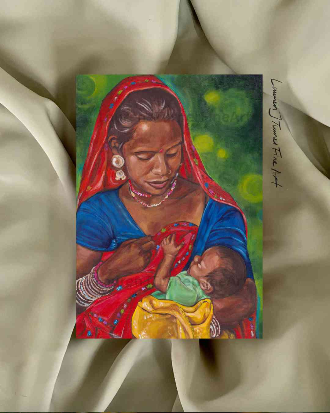 Celebrate the powerful bond between mother and child with this beautifully vibrant painting of an Indian woman holding her baby after nursing. This original artwork captures the tender, sacred connection between mother and child, highlighting the cultural beauty and significance of motherhood in Indian traditions.