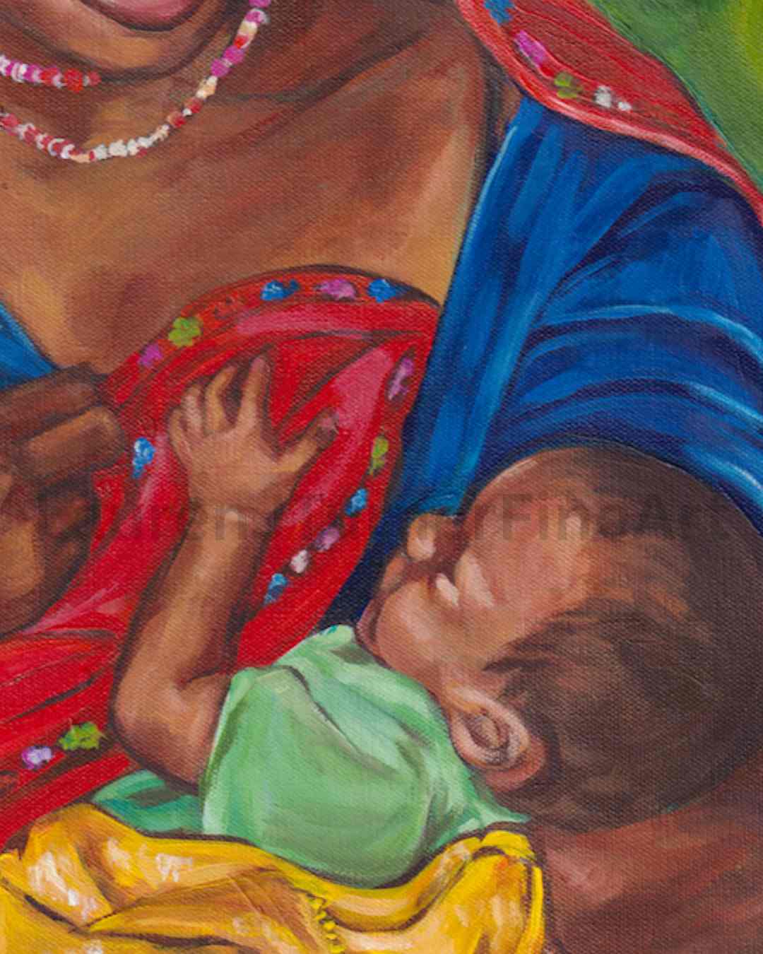 The vibrant colors of her attire contrast beautifully with the soft, nurturing embrace she offers her infant. The lush green background symbolizes growth, nature, and the life-giving force of motherhood, drawing viewers into a serene and powerful scene of maternal care.
